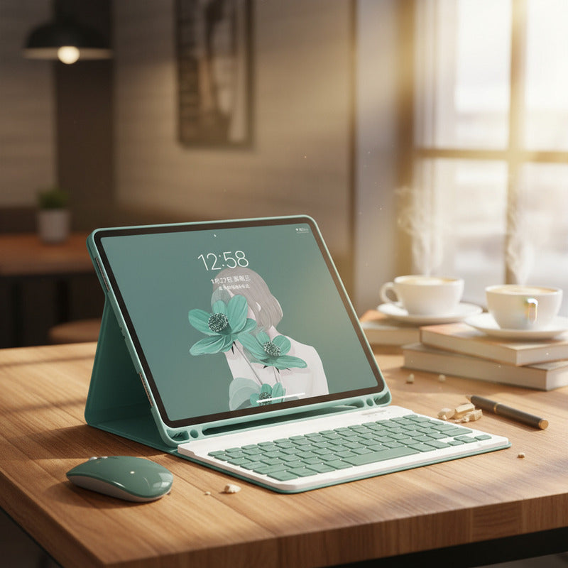 El estuche inalámbrico BlueTooth con teclado: el diseño superdelgado añade la máxima protección con un volumen mínimo (0,38 pulgadas) y le brinda una experiencia de escritura suave y cómoda. La parte inferior del teclado está diseñada magnéticamente para facilitar su extracción y hace que su tableta sea más estable. El soporte ajustable sostiene de forma segura su tableta en modo horizontal. El teclado inalámbrico está disponible. Nuestra funda para teclado dura más de 100 horas