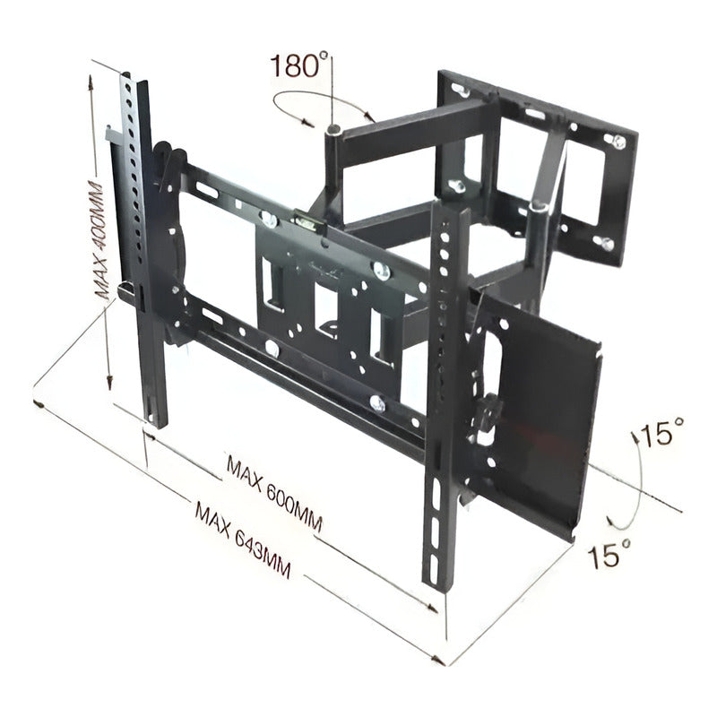 Especificaciones: - Para Tv de panel plano o flat Tv de 32 -70 pulgadas. - Inclinación: +15° a -15° - Movimiento: 120º - Soporte máximo: hasta 50 kilos. - Material: Acero - Color: Negro - VESA compatible: 75x75mm, 100X100mm, 200X200mm, 300X200mm ,300X300mm, 400X200mm, 400X300mm, 400X400mm, 400X600mm Es inclinable: Sí Tamaño mínimo de la pantalla: 32 " Marca: Generica Modelo: soporte tv Lugares de montaje: Pared Es inclinable:Sí Es articulado:Sí Es giratorio:Sí Es fijo:No Es gamer:No Tipos de pantallas compatibles:LCD,LED,Tv Tamaño mínimo de la pantalla - Tamaño máximo de la pantalla:32 " - 70 "