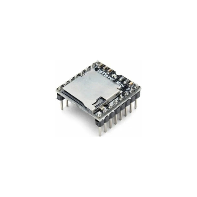 Este mini reproductor es un pequeño módulo MP3 que cuenta con una salida directa para un parlante (speaker). Puede ser utilizado como un módulo independiente, alimentado con baterías y controlado mediante pulsadores, o también en conjunto con un Microcontrolador como Arduino, con el único requisito que posean puerto para comunicación serial. Soporta formatos estándares de audio como MP3, WAV y WMA. De igual manera, soporta tarjetas microSD con sistemas de archivos FAT16, FAT32. En el modo de control serial, es posible controlar la reproducción de un archivo o pista en particular, enviando comandos simples, los que facilitan la programación y uso. Características: • Alimentación: 3.2 a 5 VDC • Frecuencias de Muestreo Soportadas (kHz): 8/11.025/12/16/22.05/24/32/44.1/48 • Conversor DAC de 24bits en la Salida • Soporta para Rango Dinámico en 90dB, Soporte SNR en 85dB • Sistemas de Archivos FAT16, FAT32 y Tarjetas de hasta 32GB • Se puede Controlar por Comandos Seriales o mediante Pulsadores en sus Entradas • Organización de Archivos por Carpeta • Soporta hasta 100 Directorios y 255 Pistas por Directorio • Posee 30 Niveles de Volumen y 6 Niveles de Ecualización EQ • Dimensiones: 22 x 22 x 18mm