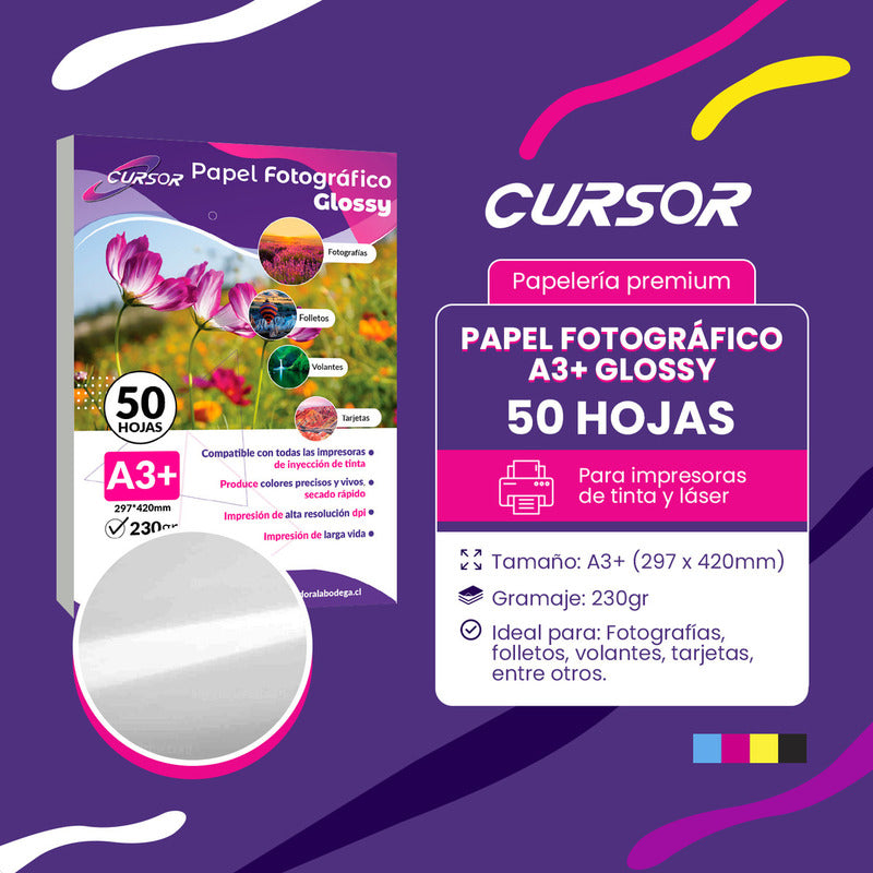 Papel Fotografico Glossy Brillante A3+(33x48) 230gr/50 Hojas Papel fotográfico Glossy o de recubrimiento brillante, tiene una textura suave y lisa. Recubiertos de resina (plastificación) que los hace más resistentes, por ejemplo, al desgarro. Colores vividos, nítidos y bien saturados con una amplia gama de tonalidades, contrastados con negros intensos. Logrando acabados profesionales en tus trabajos, ideales para impresiones de fotografía o texto. Papel diseñado para impresoras de inyección de tinta. Papel ideal para fotografías, flyers, tarjetas de presentación o cualquier tipo de impresiones gráficas.