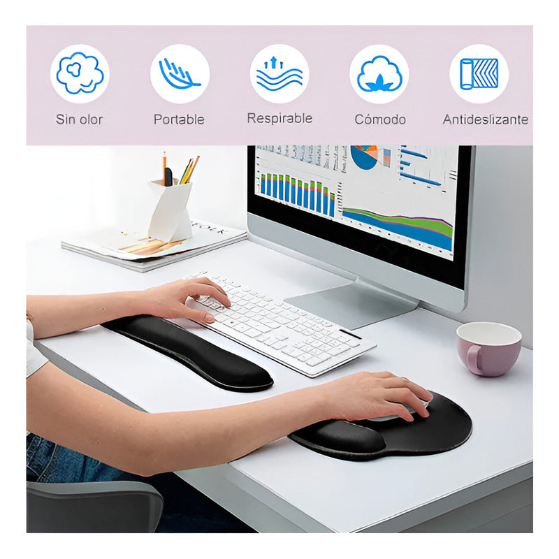 Diseño ergonómico, suave y cómodo: proporciona el máximo soporte y comodidad para la muñeca. Los reposamanos ergonómicos y el teclado pueden mejorar la postura de las manos y las muñecas cuando se usa la computadora durante mucho tiempo, prevenir problemas en las articulaciones y aliviar la presión sobre los codos y los hombros. Materiales cómodos y ecológicos: nuestros productos están hechos de materiales de alta calidad, el teclado está hecho de espuma de memoria suave y la alfombrilla del mouse. Estructura ligera, cómoda y duradera, muy adecuada para uso a largo plazo. Apto para la mayoría de los teclados y ratones. La base antideslizante garantiza un funcionamiento estable: la parte inferior del reposamanos está hecha de caucho natural antideslizante. La textura densa y antideslizante mejora la estabilidad. Siempre sostenga el cojín en su lugar. Por lo tanto, cuando mueve el ratón, no se desliza y es más estable. Práctico y fácil de limpiar: fácil de limpiar, simplemente limpie con un paño suave y húmedo, ligero y fácil de transportar, adecuado para uso doméstico y de oficina, juegos, etc. Contenidos del paquete: 1 teclado, pad 1 ratón, alfombrilla 1 descanso de la mano