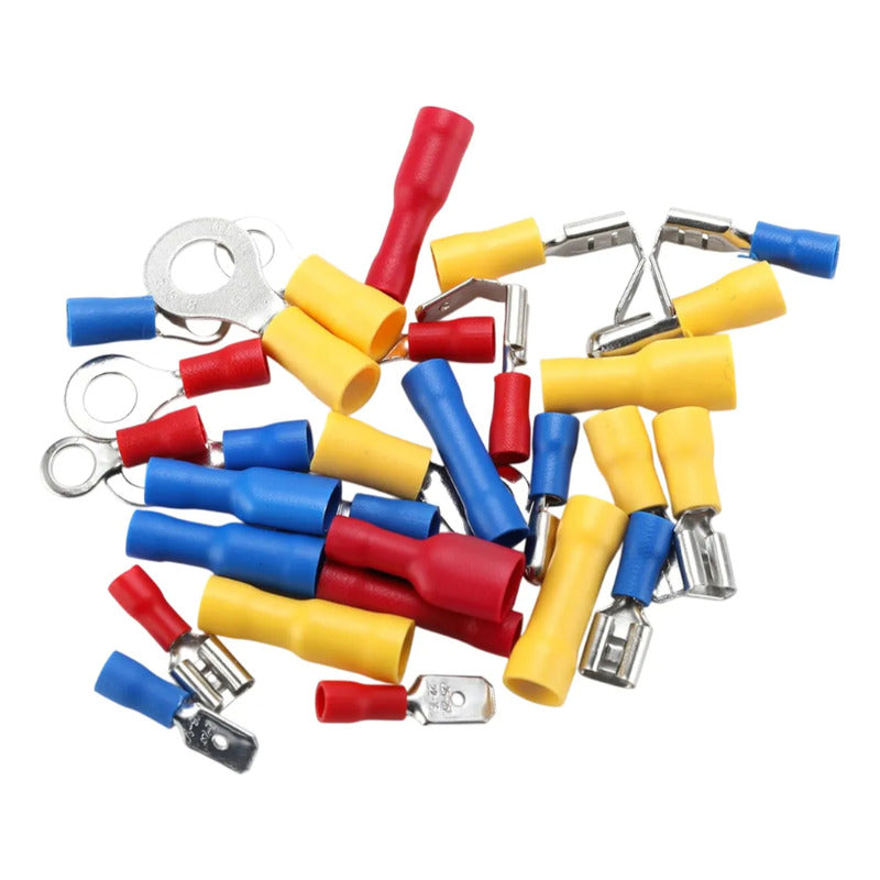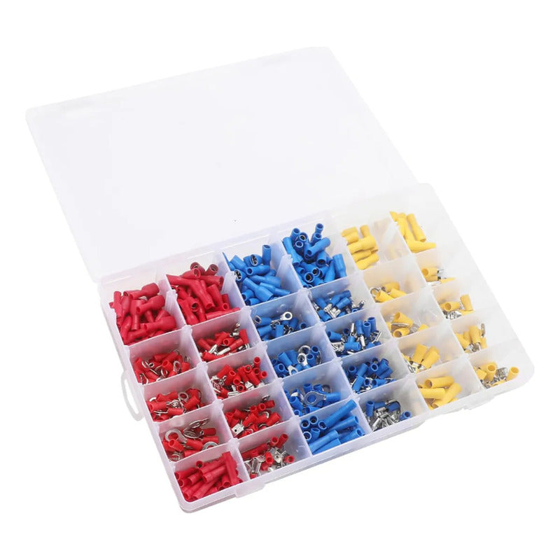 Kit 480 Terminales Aislados Eléctricos Con Caja Contenido: Anillo M4 40 unidades (20un rojas, 20un azul) Anillo M5 50 unidades (20un rojas, 20un azules, 10un amarillas) Anillo M6 50 unidades (20un rojas, 20un azules, 10un amarillas) Anillo M8 10 unidades (10un amarillas) Bala macho 50 unidades (20un rojas, 20un azules, 10un amarillas) Bala hembra 50 unidades (20un rojas, 20un azules, 10un amarillas) Pala 250 hembra 10 unidades (10un amarillas) Spade 250 Macho (semiaislado) 50 unidades (20un rojas, 20un azules, 10un amarillas) Spade 250 hembra (semiaislada) 40 unidades (20un rojas, 20un azules) Spade 250 hembra (completamente aislado) 50 unidades (20un rojas, 20un azules, 10un amarillas) Empalme a tope 50 unidades (20un rojas, 20un azules, 10un amarillas) Piggy Back 250 30 unidades (10un rojas, 10un azules, 10un amarillas)