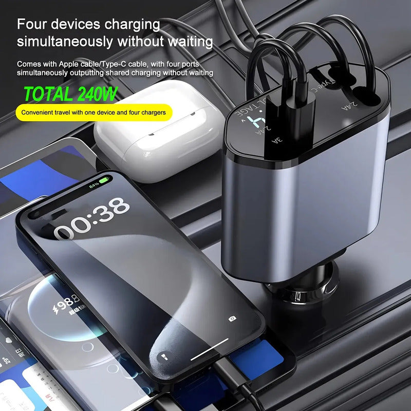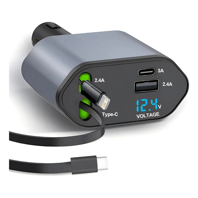 Descubre la solución perfecta para mantener tus dispositivos móviles siempre cargados mientras viajas. El cargador de auto 120W USB con 2 cables retráctiles ofrece una experiencia de carga rápida y eficiente, ideal para quienes pasan mucho tiempo en carretera. Su capacidad de carga de 120W permite alimentar múltiples dispositivos a la vez sin comprometer el rendimiento. Diseñado para vehículos con voltaje de entrada de 12/24V, este cargador es compatible con una amplia gama de smartphones y dispositivos móviles. Los conectores USB-C garantizan una conexión segura y rápida, mientras que los cables retráctiles evitan enredos, brindando comodidad en cada uso. La versatilidad de su diseño lo convierte en un accesorio imprescindible para cualquier conductor. Mejora tu experiencia de carga en el auto con este cargador que combina funcionalidad y estilo. Ya no tendrás que preocuparte por quedarte sin batería en esos momentos críticos. Con su diseño práctico y eficiente, podrás disfrutar de cada viaje sin interrupciones causadas por la falta de energía en tus dispositivos.