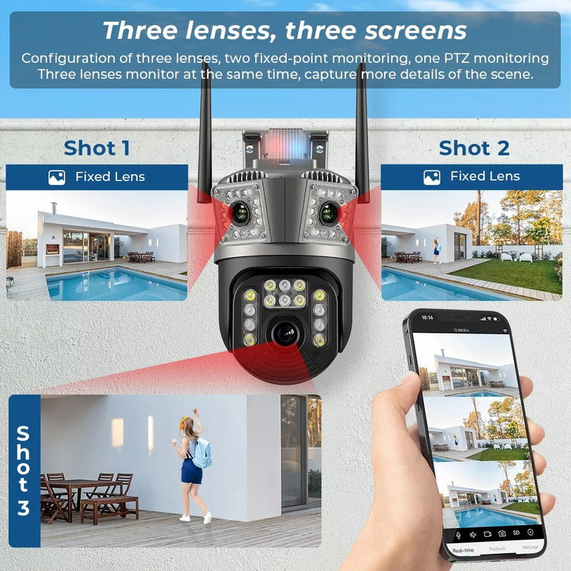 ANBERX Cámara de Seguridad Exterior, 2K HD Cámara de Seguridad Wifi de Doble Lente e Imagen Dual con Alarma, Cámara de Seguridads Inalámbricas con Visión Nocturna y Audio para El Hogar Granja Tienda Almacén ANBERX se ha asociado con varias fábricas que han estado trabajando en sus respectivos campos -- Equipos de Vigilancia durante décadas. Estamos confiados para ofrecer los productos de alta calidad, el conocimiento profesional de la función y el servicio caliente a nuestros clientes con el producto asequible. -------------------------------- -------------------------------------- -------------------------------------- ------ **NOTA** 1.solo es compatible con wifi de 2,4 GHz, no es compatible con wifi de 5 GHz 2.La tarjeta de memoria debe insertarse cuando la máquina está apagada, y no se detectará cuando se inserte cuando la máquina esté encendida. 3.Versión 12MP: (12MP = 4MP + 4MP + 4MP) Consta de tres objetivos separados de 4MP y tres pantallas que suman 12MP. -------------------------------- -------------------------------------- -------------------------------------- ANBERX camara de seguridad exterior wifi de casas. Tanto si desea vigilar su hogar mientras está fuera, como si desea vigilar su negocio o simplemente garantizar la seguridad de su propiedad, la camara seguridad 3 en 1 P16Q es la solución perfecta para todas sus necesidades de seguridad. Nuestras ventajas sobre otras cámaras de seguridad exterior: >>Unión de cámara bala y cámara domo, diseño 2 en 1 >>Imágenes 4K HD y visión nocturna en color: las cámaras de seguridad solares inalámbricas para exteriores le brindan imágenes y videos 4K full HD, 12MP más claros que otras cámaras de seguridad 1080P de día o de noche. 3 modos de visión nocturna (a todo color, blanco y negro, inteligente) para elegir. El sensor CMOS incorporado y las luces IR detectan automáticamente la luz ambiental y cambian al modo de visión nocturna en color, vea detalles más claros e imágenes en color incluso en oscuridad total hasta 65 pies. >>Cámara de seguridad con zoom de 8X y audio bidireccional: zoom digital de 8X para ver detalles más claros con una imagen ampliada. Cámara de seguridad inalámbrica para exteriores, micrófono y altavoz con reducción de ruido incorporado, le permite comunicarse claramente con los transportistas o visitantes, o advertir a los sospechosos. La cámara de seguridad para el hogar admite que varias personas vean vídeos en vivo simultáneamente y protejan su hogar juntos. La resistencia al agua IP66 puede funcionar bien en condiciones climáticas adversas como lluvia, granizo, tormenta, nieve y sol. >> Detección de movimiento PIR y seguimiento automático: con un sensor PIR avanzado, la cámara inalámbrica para exteriores puede detectar el movimiento humano y rastrearlo, enviar notificaciones de alerta en tiempo real a su teléfono, activar una sirena fuerte, un foco o una alarma sonora para ahuyentar a los visitantes no deseados. . Grabación de eventos en tarjeta micro SD de hasta 128 GB (no incluida) y en la nube con datos seguros cifrados. Puede ver y reproducir lo que está sucediendo en cualquier momento y en cualquier lugar. El tiempo, la zona y la sensibilidad de detección son ajustables. >> Cobertura de 360: las cámaras de seguridad para exteriores PTZ inalámbricas wifi para exteriores admiten una rotación horizontal de 355 y vertical de 90, lo que le proporciona una protección integral de 360 casi sin puntos ciegos. También puede girar manualmente la cámara wifi para ver diferentes direcciones y monitorear cualquier rincón de forma remota a través de la APLICACIÓN, ¡protegiendo su propiedad y su familia! >>>Funciones básicas: (1) Control PTZ Remoto/Zoom 8X camara de vigilancia con horizontal 355 grados vertical 90 grados para capturar un ángulo de visión más amplio y cubrir más áreas de la pantalla, cámaras de seguridad wifi admite zoom digital 8X y enfoque automático, para garantizar una vista clara al hacer zoom en videos e imágenes. (2) Detección Del Cuerpo Humano/Notificación De La Aplicación: Recibirá notificaciones cuando la cámara wifi de seguridad detecte movimiento, lo que facilita la verificación de la seguridad del hogar en tiempo real. (3) Audio bidireccional Camara ip wifi tiene un micrófono y un altavoz integrados, puede chatear con los visitantes en tiempo real o advertir a los intrusos no deseados cuando no está en casa. (4) IP66 a prueba de agua El material impermeable de la cámara de seguridad wifi seguridad es perfectamente resistente al viento/escarcha/lluvia/nieve y también funciona perfectamente en un rango de temperatura de -10 a 60 grados centígrados. (5) Comparte Con Miembros De La Familia Puede compartir fácilmente estas cámaras de seguridad con los miembros de su familia para divertirse o cuidar a niños o ancianos en cualquier momento y en cualquier lugar. ----------------Parámetro Técnico-------------------------------- ------ Software móvil: iCSee Material: ABS Aplicación: Interior Vista: Giratorio 355 Pan & 90 Tilt, Zoom óptico 8X Codificación de vídeo: H.265/25fps (la compresión ahorra un 50% de espacio de almacenamiento) Visión nocturna: 30m (dependiendo del entorno) Audio bidireccional: soporte (micrófono y altavoz incorporados) Temperatura de trabajo: -10 60 centígrados Fuente de alimentación: entrada de CA: 100 240 V, salida de CC: 12 V/0,5 A Soporte de memoria: Micro SD/almacenamiento en la nube, admite tarjeta SD de 8 GB a 128 GB Potencia: 6W Modo de alarma: alarma de aplicación Sistema de teléfono móvil compatible: para Android, iOS, PC Soporte: RTSP/Onvif/UDP/TCP/DHCP/DDNS/UPnP Inalámbrico: 2.4G IEEE 802.11 b/g/n, compatible con WEP, WPA y WPA2 Interruptor de filtro (corte IR): corte IR incorporado, sin diferencia de color entre interior y exterior Parámetros de la lente: 8 millones de píxeles --------------Contenidos Del Paquete-------------------------------- - - - 1 * Cámara 