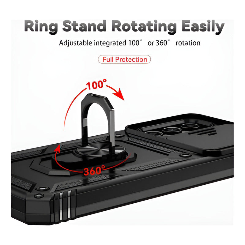 - Cuenta con soporte tipo anillo para evitar caídas imprevistas. - El anillo se adapta a cualquier soporte magnético de auto. - El anillo gira en 360º, esto permite poner el teléfono en diferentes posiciones. - Cubre los bordes y botones. Sin dejarlos duros y molestos. - Resistente a golpes y caídas.