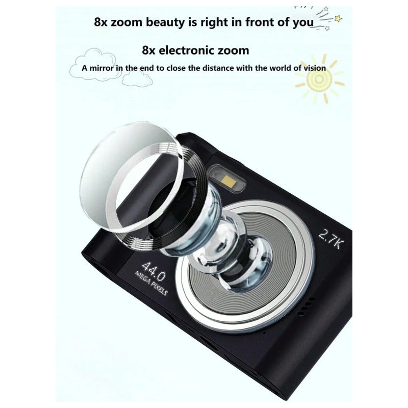 Tipo de cámara digital: cámara inteligente Escenarios aplicables: portátil para viajar Modo de funcionamiento: funcionamiento totalmente manual Tipo de sensor: CMOS Tamaño del sensor: 1/2,5 pulgadas Píxeles efectivos: 24 millones y más Factor de zoom óptico: 8x Relación de zoom digital: 8x Resolución máxima: 2400×1600 Tamaño de pantalla LCD: 2,4 pulgadas Tipo de pantalla: pantalla HD Medio de almacenamiento: tarjeta SD Memoria corporal: ninguna Tipo de lente: Periscopio Rendimiento antivibración: antivibración electrónica. Interfaz de datos: USB2.0 Material: ABS Dimensiones totales: 58 mm * 28 mm * 97 mm Tipo de batería: batería de litio Peso del producto: 104 (g) Ocasiones aplicables para regalar: bodas, cumpleaños, festivales, inauguración de casas, ferias comerciales, promociones publicitarias, beneficios para empleados, celebraciones de aniversario, obsequios empresariales, ceremonias de apertura, conmemoraciones de premios, planificación de relaciones públicas, otros.