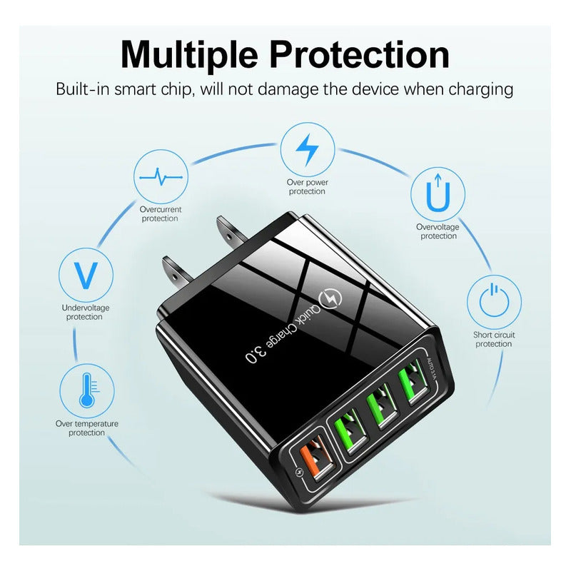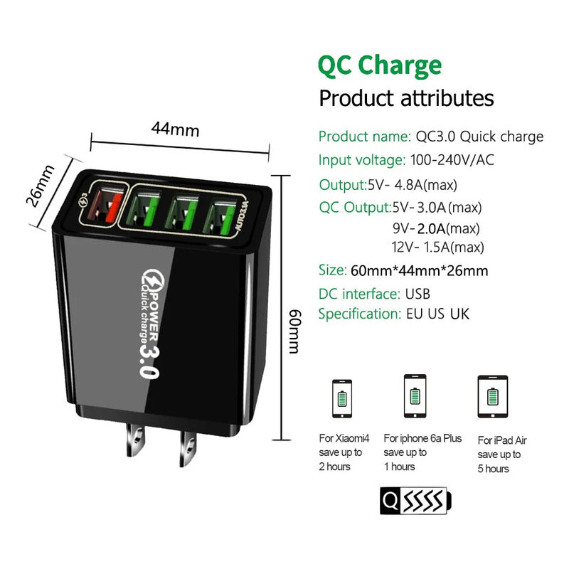 Descripción El cargador de pared 4 en 1 con un puerto ultra rápido con tecnología Quick Charge (Color rojo) o que Qualcomm denomina como INOV: Negociación Inteligente para la obtención del Voltaje Óptimo. Es un algoritmo que permite a un dispositivo móvil determinar qué potencia requiere de la batería, el cargador, en cada momento; de esta forma se maximiza la carga sin comprometer demasiado la eficiencia o vida útil de la batería. También cuenta con 3 puertos de carga 3.1 (Color verde) que te ayudarán a cargar todos tus dispositivos. Incluye protector de voltaje e indicadores LED. Carga Turbo 3.0 Amplia compatibilidad El cargador USB multipuerto funciona con la mayoría de los dispositivos USB. Carga baterías de gran capacidad de forma segura y rápida. Este cargador de móvil ideal es adecuado para cargar iPhone, Google Phone, Samsung Galaxy Phone, realme, Xiaomi, Huawei, tabletas y otros dispositivos de carga. Cuenta con sistemas de seguridad anti descargas. Entrada: 100-240 Voltios Bivolt 50-60HZ Salida USB1: (Rojo): 5V/3A 9V/2A 12V/1.5A Salida USB2, USB3 Y USB4: 5V/3.1A (Máximo) Este cargador de pared incluye los siguientes atributos: - Protector de sobre tensión - Protector de voltaje - Protector de corto circuito - Protector de sobrecarga - Protector de temperatura - Protector antiestático