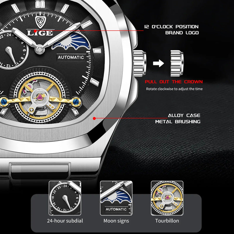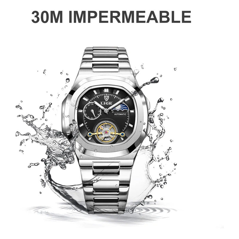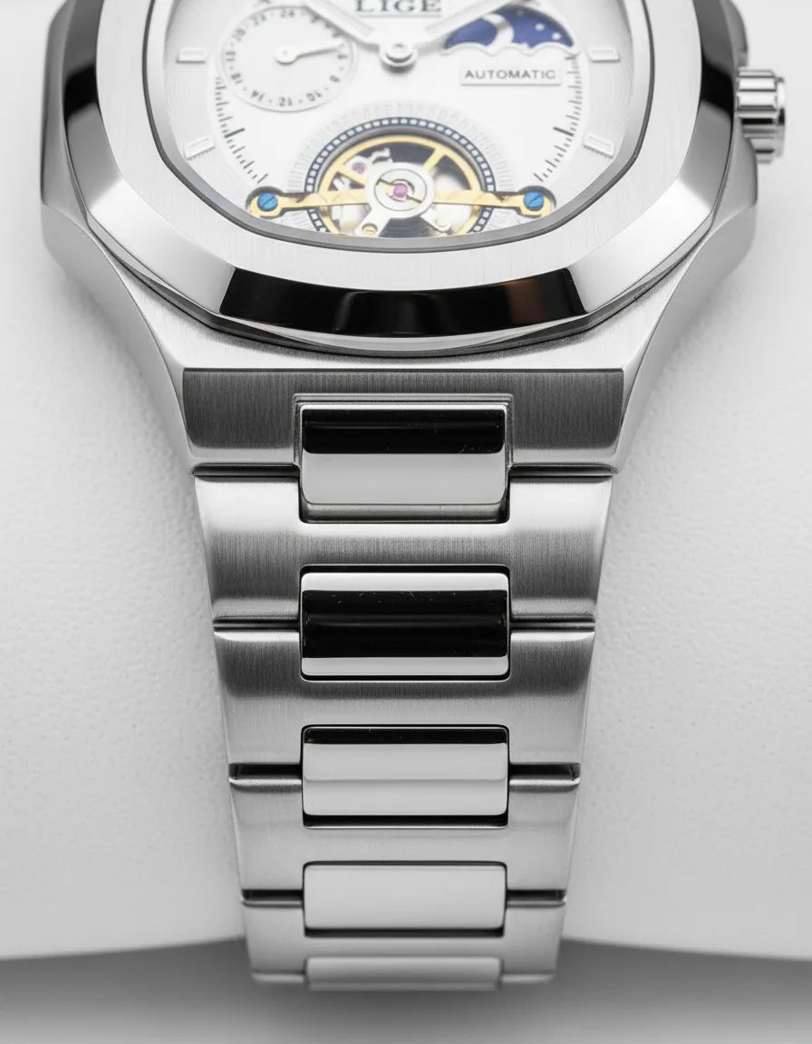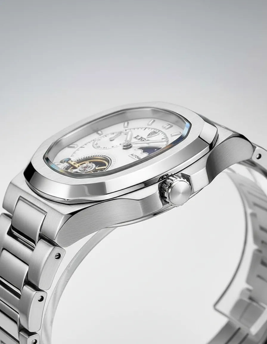 Este reloj automático para hombre combina elegancia, funcionalidad y un toque astronómico gracias a su complicación de fase lunar. Su diseño abierto permite apreciar el movimiento interno, añadiendo un carácter cómodo que destaca en la muñeca. Fabricado en acero inoxidable y disponible en colores negro, plateado y blanco, es una pieza versátil que acompaña tanto en entornos formales como casuales.