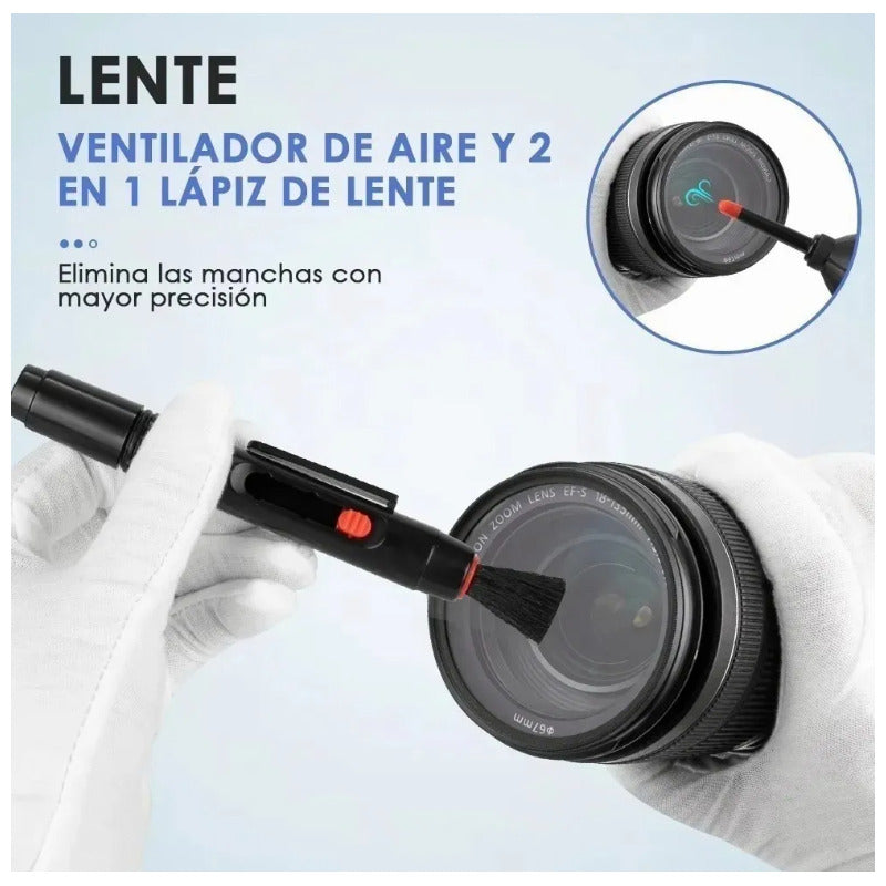 El juego de limpieza de cámara de 10 piezas contiene: Bolígrafo para lentes Cepillo de limpieza de lana Cepillo retráctil para pintalabios Solución de limpieza 50ml Bastoncillo de limpieza del sensor×2(seco) Hisopo de algodon de madera puntiaguda Golpe de aire de goma Papel para lentes Paño de perlas -------------------------------------------------------------------- Kit de limpieza profesional --- Diseñado específicamente para cámaras DSLR y lentes de cámaras ópticas, este kit de limpieza de cámara puede limpiar de alta densidad, es seguro y no tóxico, y elimina igualmente el polvo y las manchas sin dañar la lente. No solo para la limpieza de cámaras, sino también para teléfonos móviles, ordenadores, gafas, etc. Práctico Conjunto de Limpieza --- El conjunto de limpieza de la cámara es adecuado para limpiar todo el vidrio y los plásticos. El uso correcto de las herramientas del kit puede prolongar la vida útil del equipo, mantener una claridad de alta calidad y limpiar todo el polvo y la suciedad de forma segura. Estuche de Transporte Portátil --- Viene con un estuche de transporte de herramientas portátiles, el kit de limpieza se puede llevar con usted cómodamente. Tiene un espacio interno espacioso y puede almacenar fácilmente todos los accesorios de limpieza juntos. El estuche exterior negro duro y cerrado es resistente a la suciedad y duradero y puede evitar que el kit de limpieza se ensucie. Paño de Limpieza de Microfibra --- El paño de microfibra suave puede limpiar fácilmente el polvo y las manchas invisibles en la cámara y la lente, sin rayones, sin daños y sin rastro de uso.